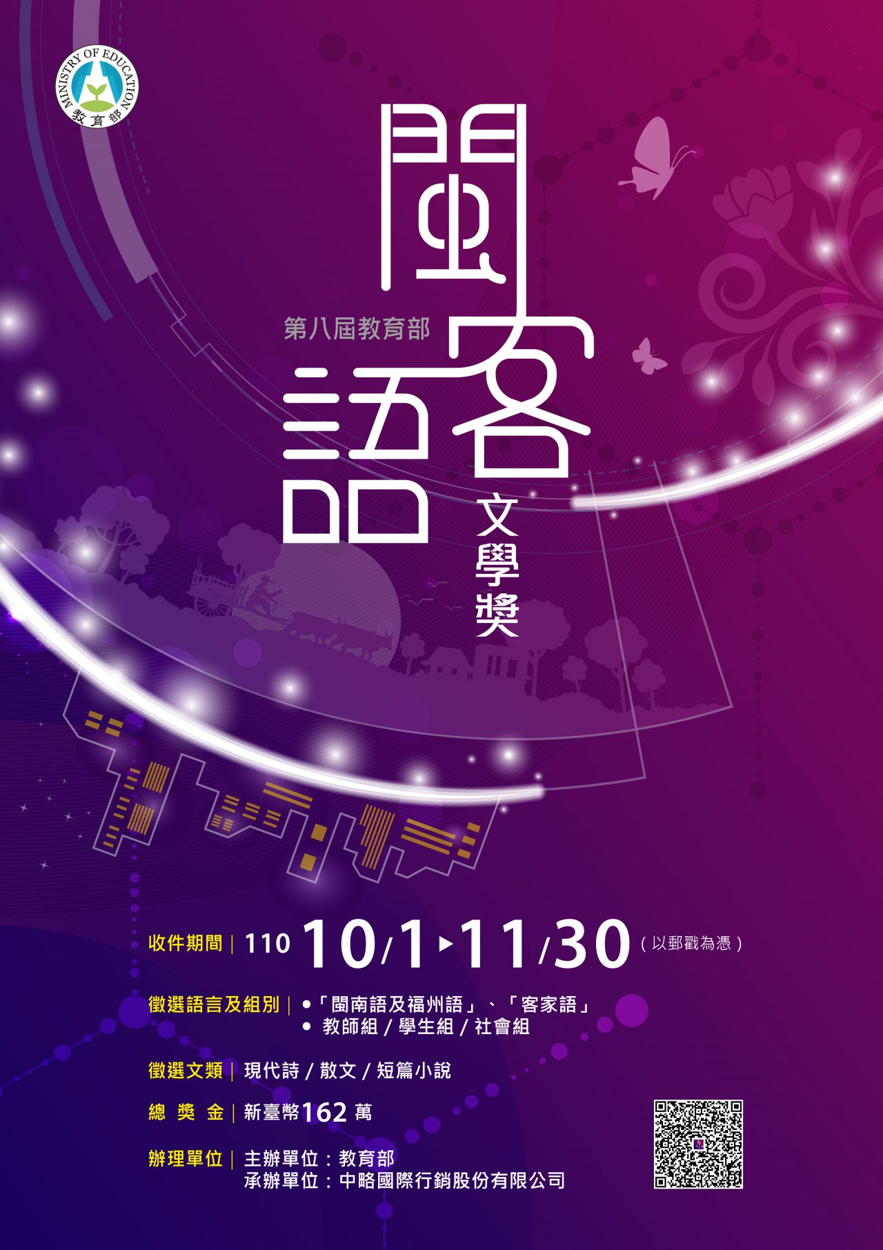 | 三、 | 旨揭活動徵件日期自 110 年 10 月 1 日起至 110 年 11 月 30 日止,詳情及簡章資料下載請至教育部終身教育司網站( https://depart.moe.edu.tw/ED2400/Default.aspx )電子布告欄,或電洽:( 02 ) 2726-2230 分機 125 曹小姐。 |