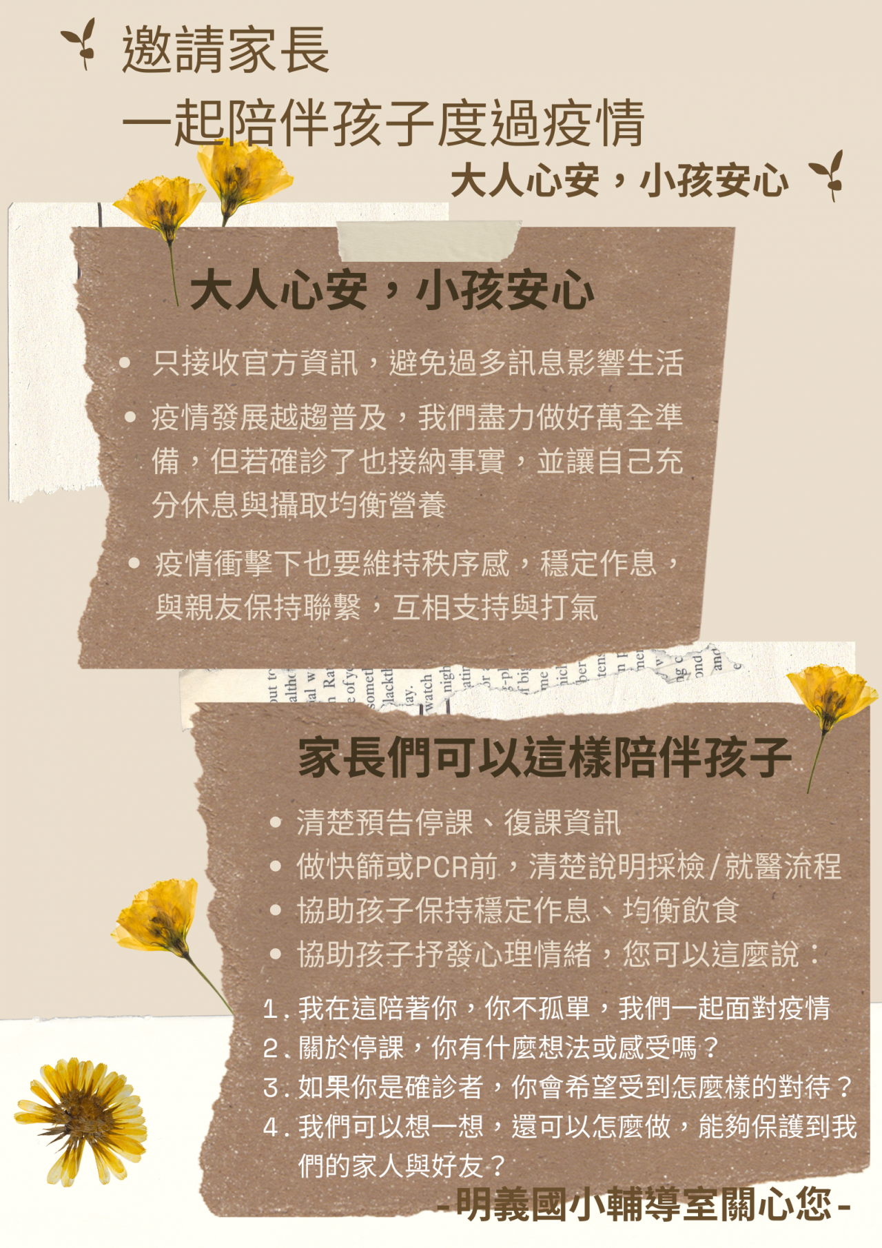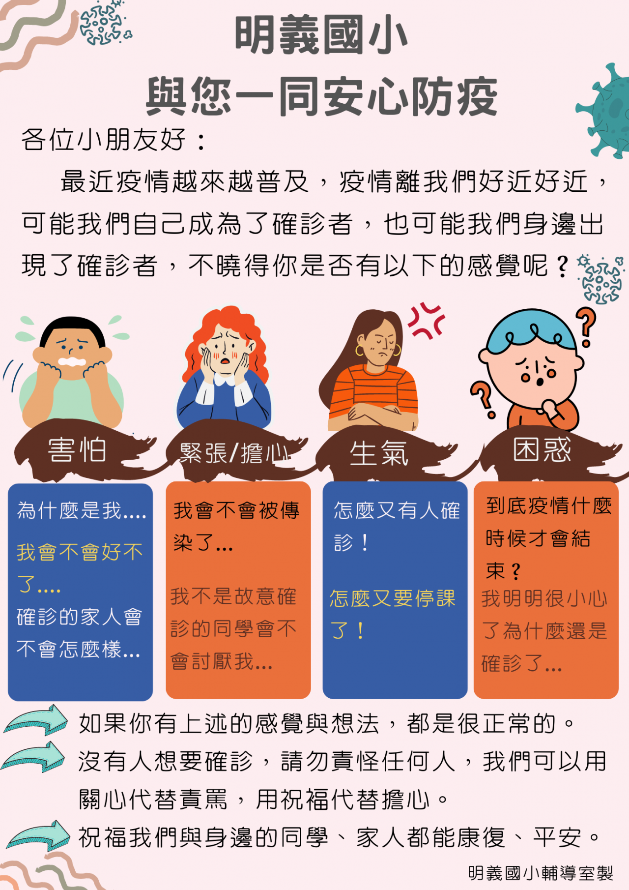 近期疫情發展越趨普及,輔導室專輔老師製作安心文宣供導師、學生、家長參考,有需要的導師請轉傳班級群組,邀請家長一起陪伴孩子度過疫情~~