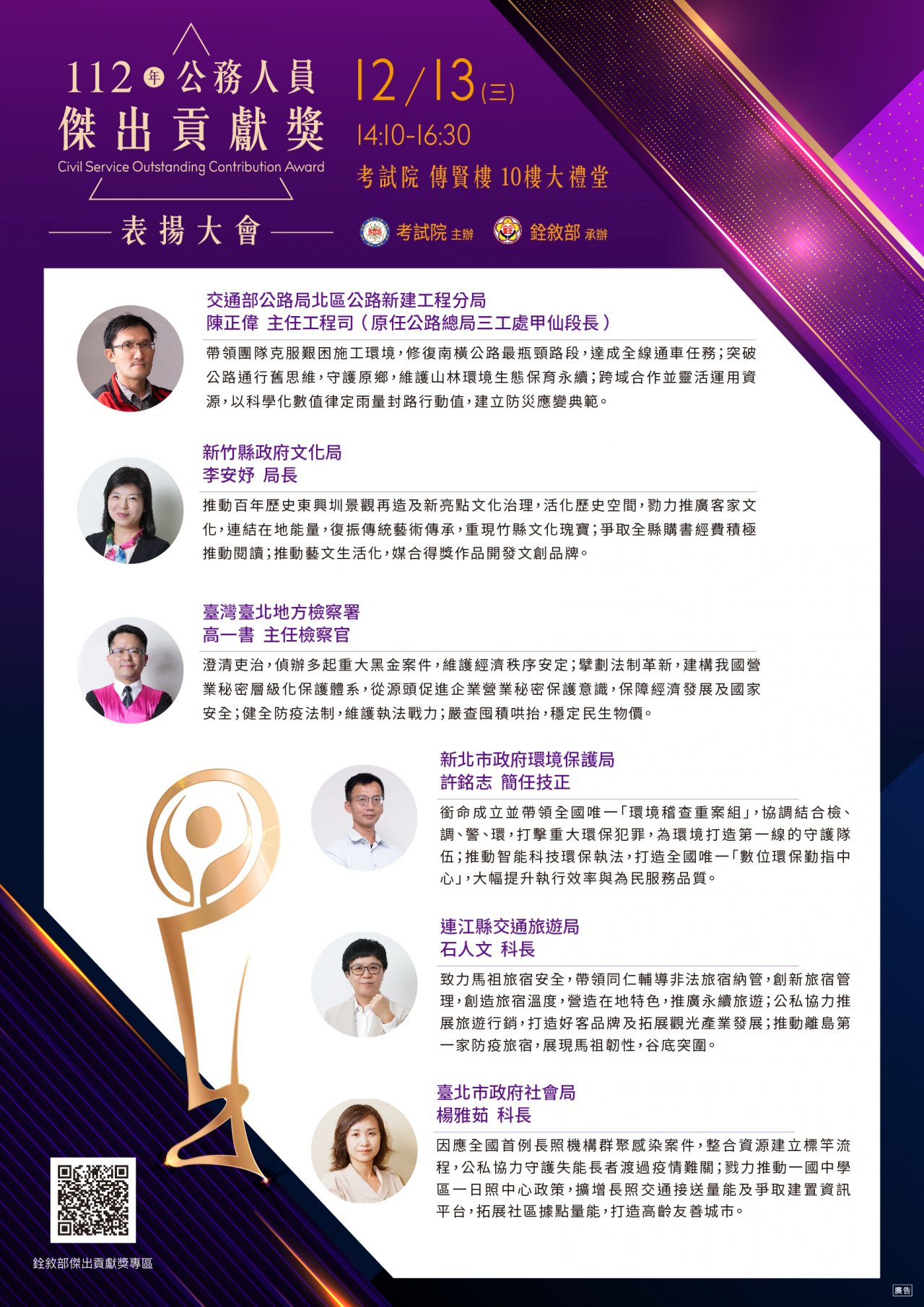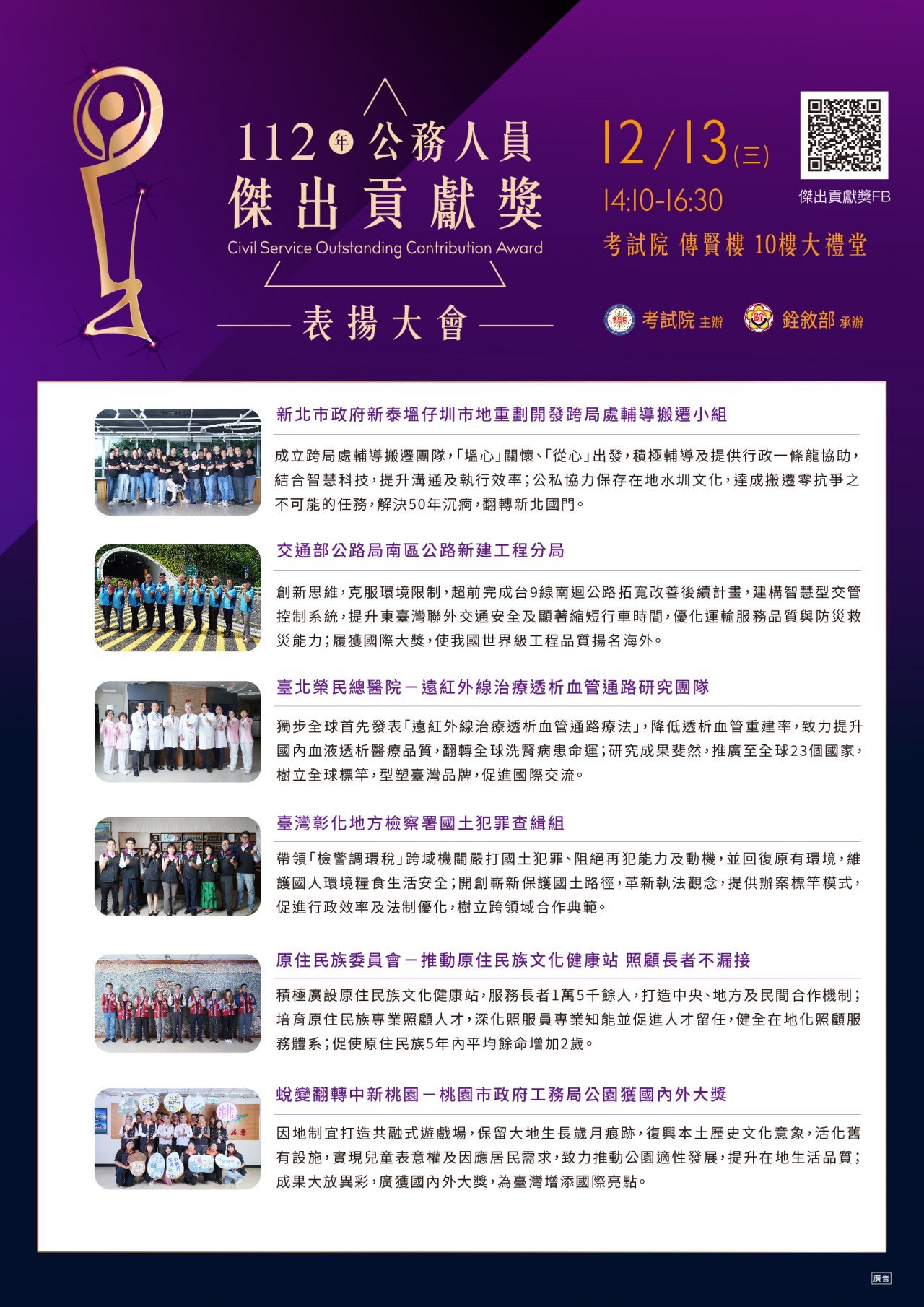 轉知「112年公務人員傑出貢獻獎表揚大會」 海報及得獎者具體事蹟簡介,網路抽獎活動及表揚大會直播等相關訊息。