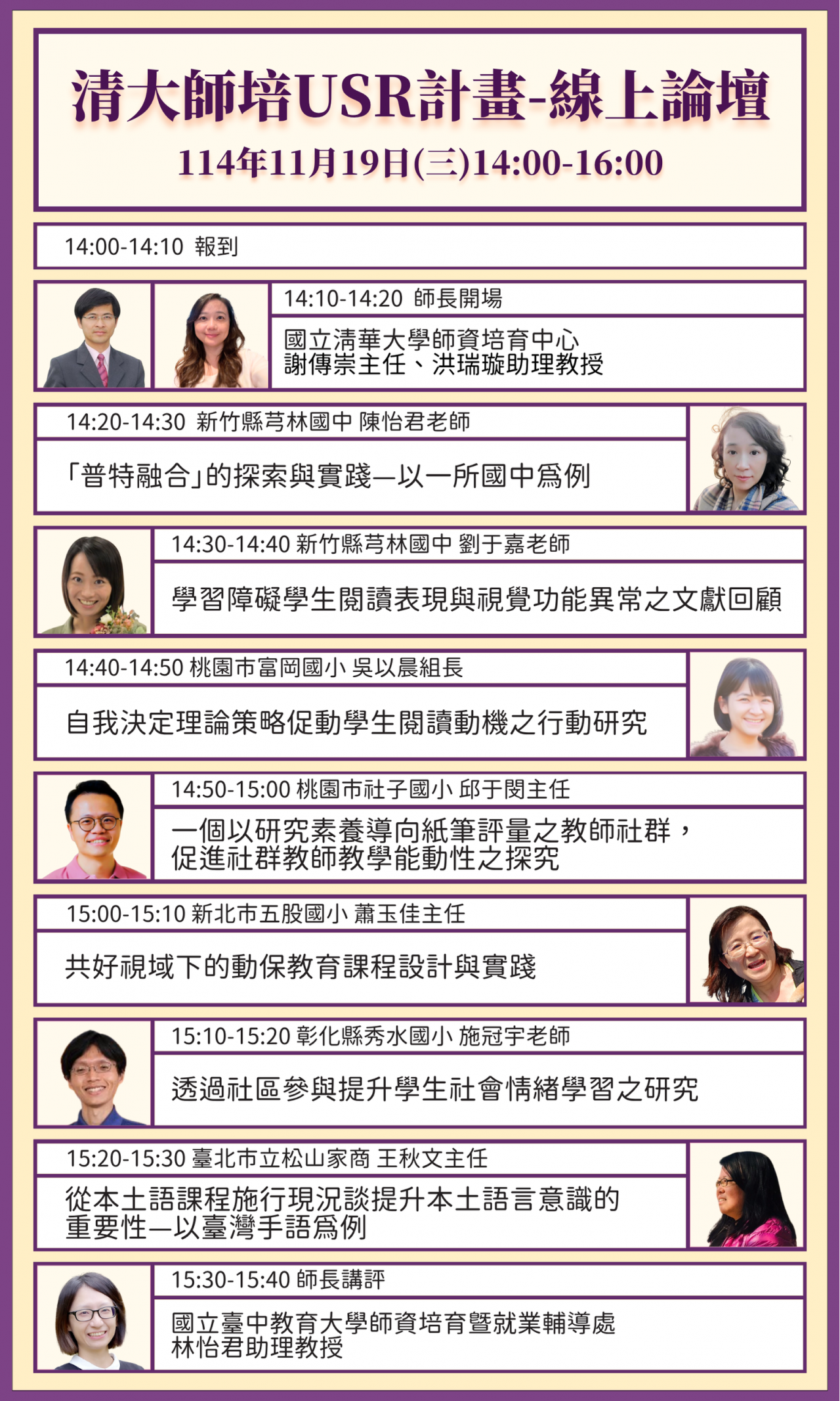 國立清華大學師資培育中心辦理「教育的跨域創造力:豐碩大學與中小學、幼教、特教及師資生協作之專業資本」計畫線上論壇