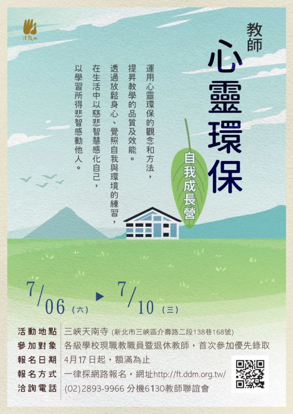 財團法人法鼓山佛教基金會訂於108年7月6日(週六)至7月10日(週三)辦理「2019 暑假教師心靈環保自我成長營」活動,詳如說明。